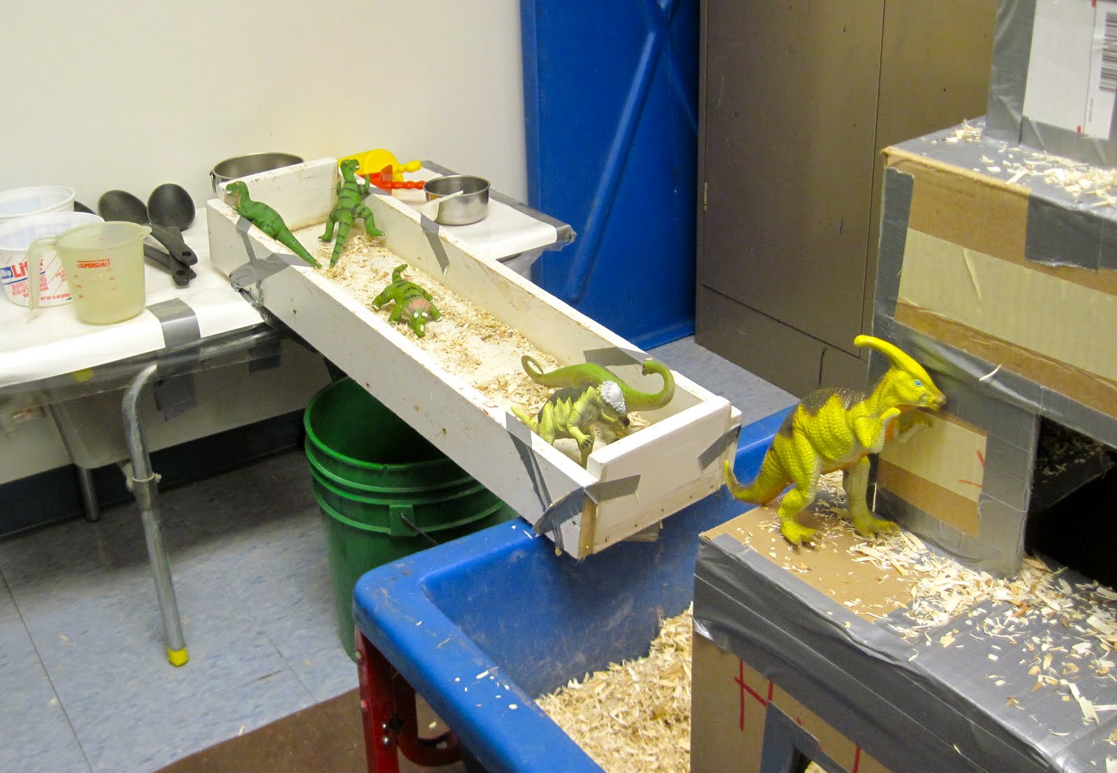 Did you guess what he was going to do?  I did not.  That is why I followed him.  He did it several times, which gave me the chance to follow him.  All his actions looked planned and purposeful.  First he would transport the animal bedding with his cup; dump the contents on the corner of the apparatus; and then use the dinosaur to scatter the pile.  Why does he transport the bedding from basically one end of the table to the other?  He could have just got animal bedding from a closer point. Maybe there is something about physically moving in and around objects and obstacles that motivates a child to action.  After piling the bedding, why does the dinosaur knock it down?  Is that what dinosaurs do?  Did you see his face?  It was like he was in dinosaur character.  And then why does he stop, look a bit surprised, and then look around inquisitively?  Maybe he surprised himself when he and the dinosaur knocked some of the bedding on the floor.  Nobody seemed to take care, so the dinosaur finishes the job of obliterating the pile.  Flop, flop, flop, flop goes the dinosaur.  Like I said, he did it several times.  Why this scenario?