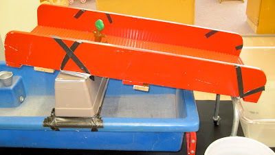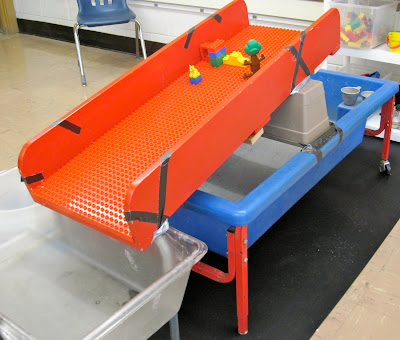 I have been asked how long I keep the same apparatus in the sensory table. I usually keep it in the table one week. Every once in awhile I keep the same apparatus in the table for two weeks, but the second week, I exchange the medium in the table to create a totally new and different experience. One of the apparatus I keep for two weeks is the Water Ramp from last week's post.