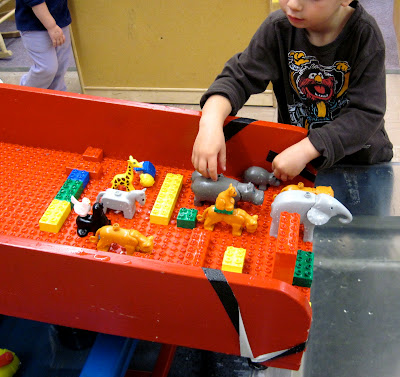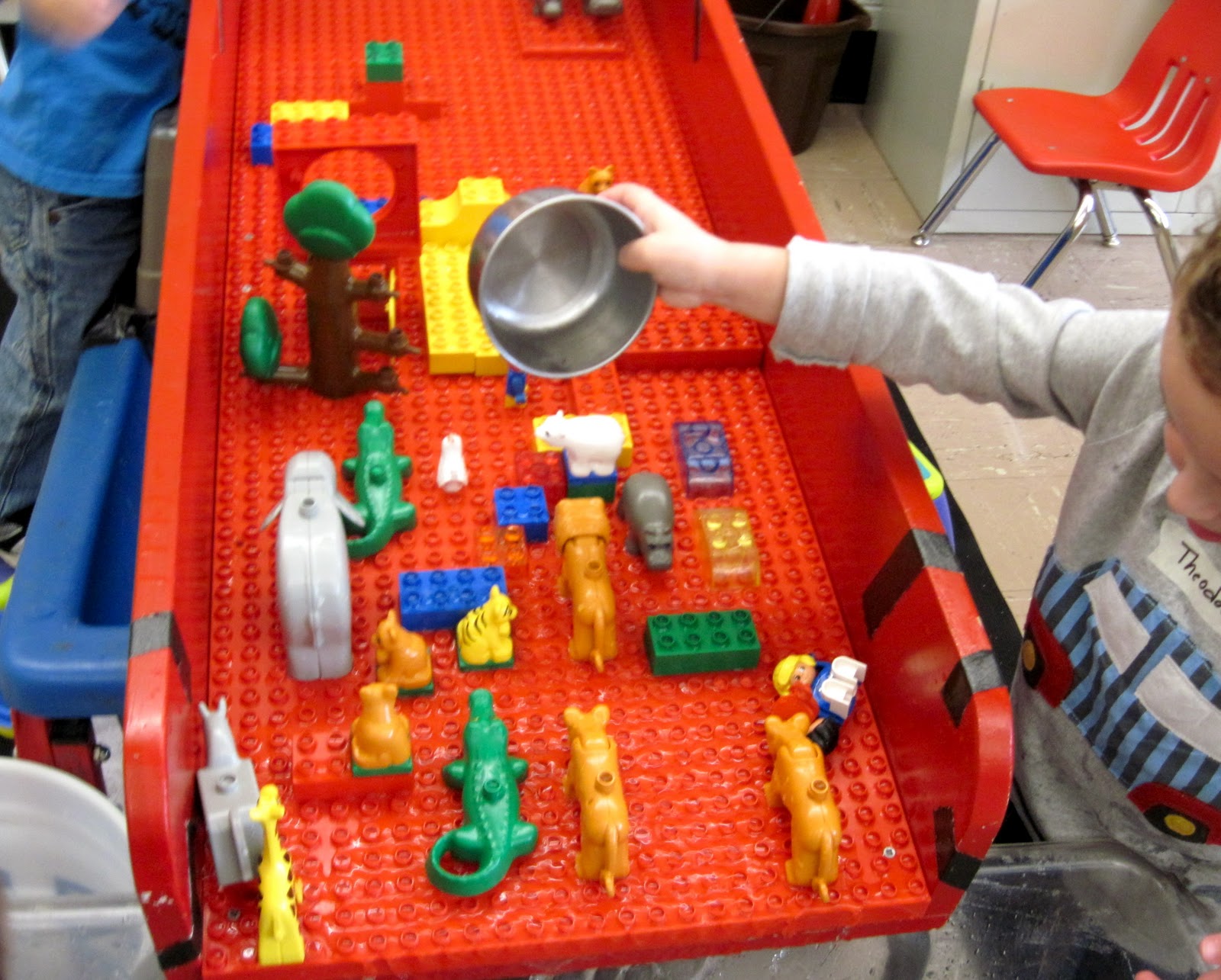 Colleagues have always asked me whether I allow children to help build the apparatus I make for the sand and water table. To this point, I have not. But in an attempt to provide a building experience for children at the sensory table, I made a Duplo Board Ramp.