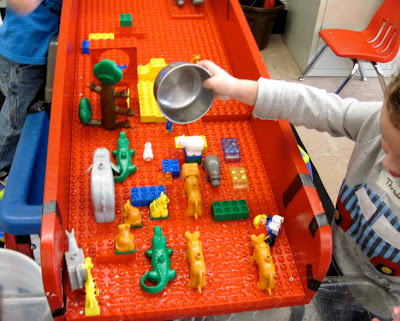 I really appreciate the experimenting that goes on at the sensory table. Some of that experimentation comes from bringing things from other parts of the room to the table. For instance, I do not know how the duplo figures got from the other end of the room to the sensory table. Not only were they good figures to see if the force of the water could knock them over and down, but they were also good for other things such as figures floating down the ramp through the obstacles.