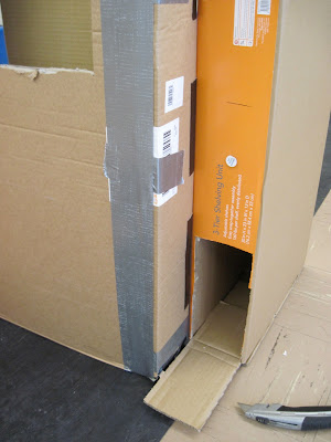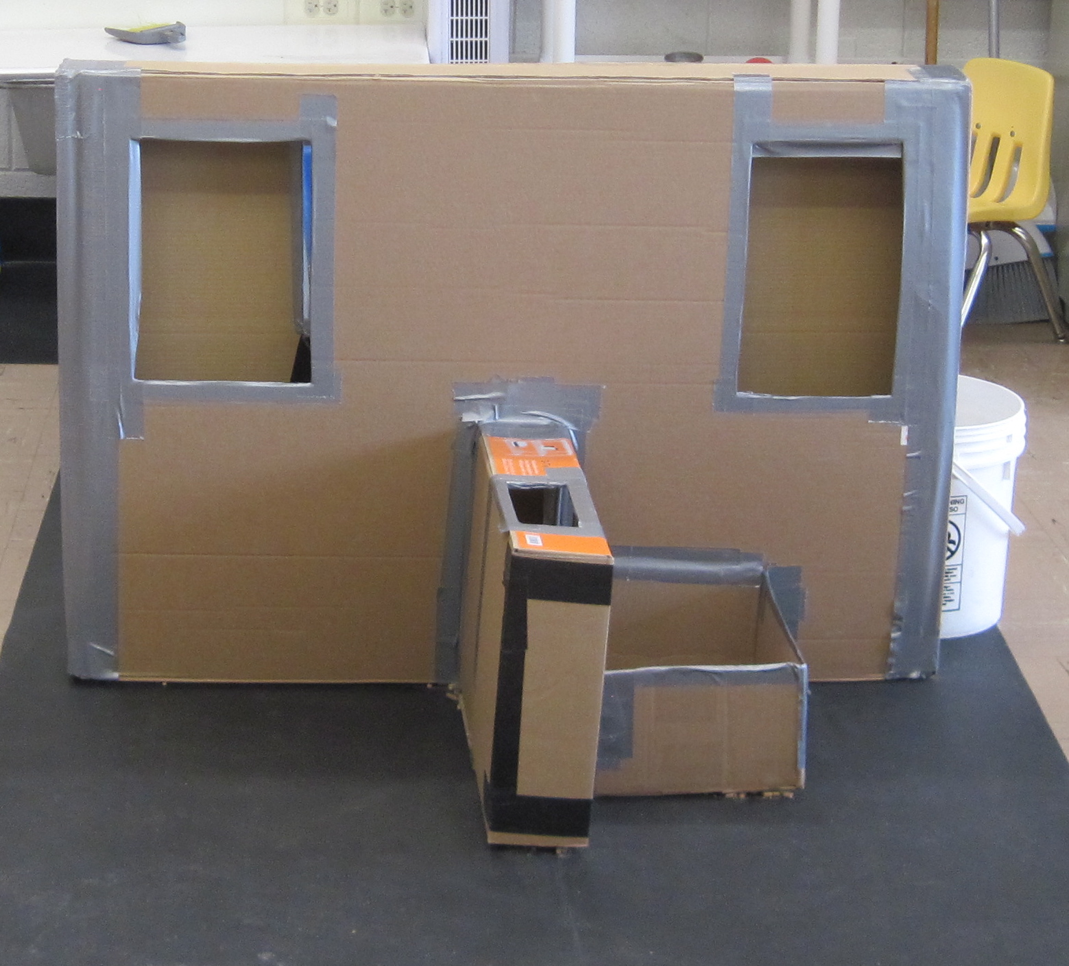 I then taped the smaller box to the bigger box on all sides. So the box below is connected to the bigger box by the hole in the bottom of the smaller box matching a hole in the bigger box. (If you can understand that, then you must be really good at putting things together from directions that come in packages. If you did not understand, no problem, just experiment with attaching boxing by embedding and not embedding.)
