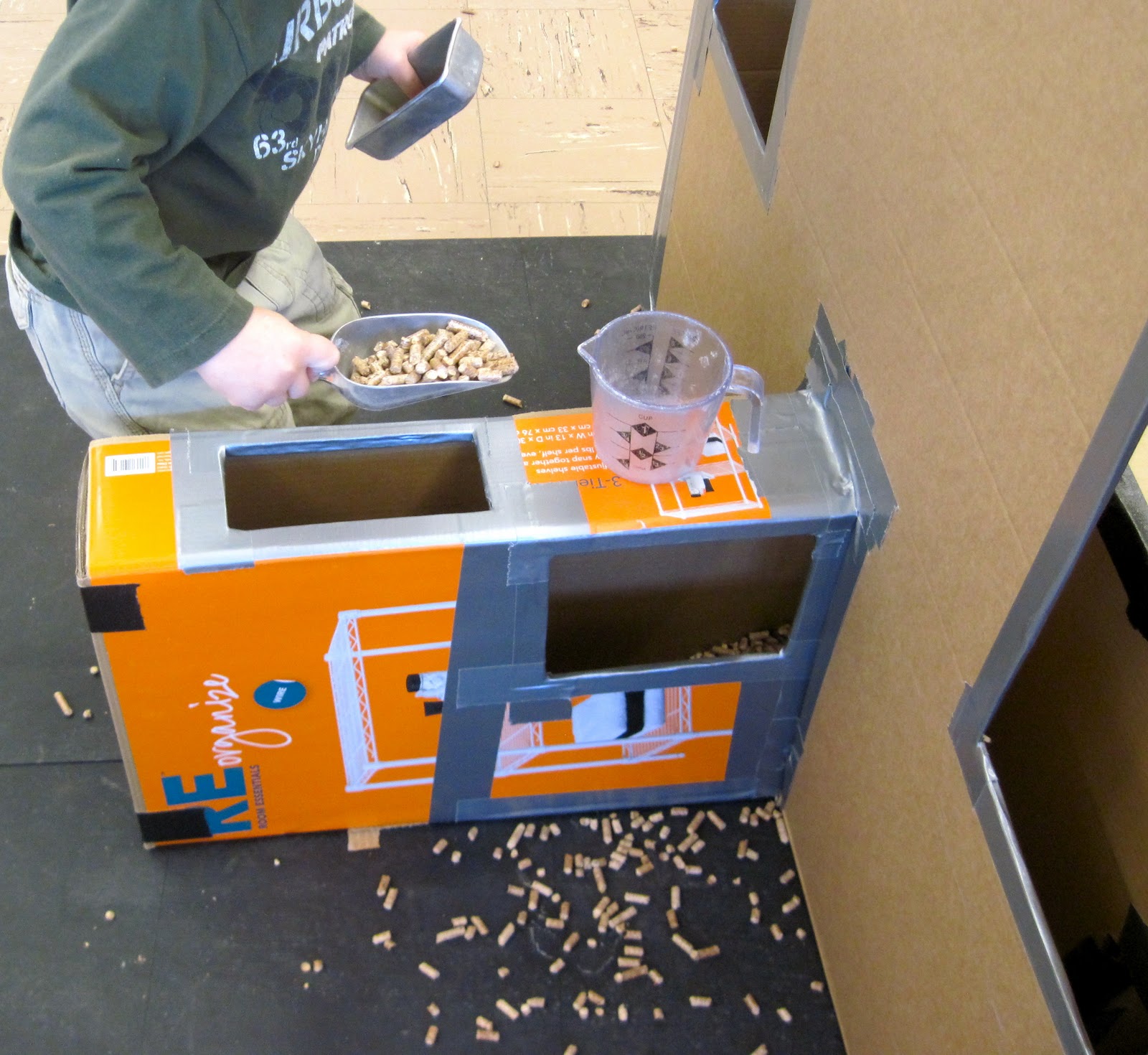 Did you notice that the space not only includes the holes of the box, but the top of the box, which provides another space on which to operate. The boy has set the measuring cup on the top of the orange box and is about to take the pellets he has just scooped from the hole and pour them into the cup