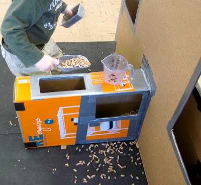 This doesn't fit with the theme of vertical boxes, but it does catch the pellets that were spilling out of the hole on the side of that orange box. Besides that, it also creates a place to put a bowl for the following activity. Watch and see what I mean.