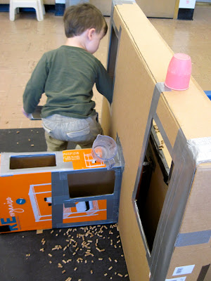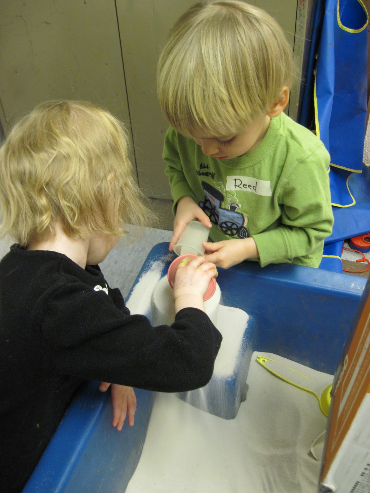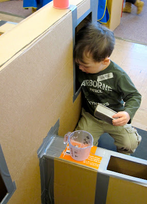 If you can visualize the spaces these two are operating in, you would know that their heads at one point in the video are only separated by about the six inches---the depth of the large vertical box. Though their heads are close, they are operating on two different levels. The boy kneeling is basically operating on the floor. The other boy is scooping from the table into the large hole of the box. They might as well be playing totally separate spaces. But wait. What you may not be able to visualize is that the boy scooping the pellets from the table and pouring them in the larger box is supplying the child who is kneeling with more pellets. In other words, one child is operating on the pellets and wondering where are they going, while the other one is counting on a continual supply of pellets. So they are connected even though they do not know it. It doesn't show in this video, but at times the children figured that out. That, in turn, changes the nature of the play and the nature of the communication between children. Pretty interesting, no?