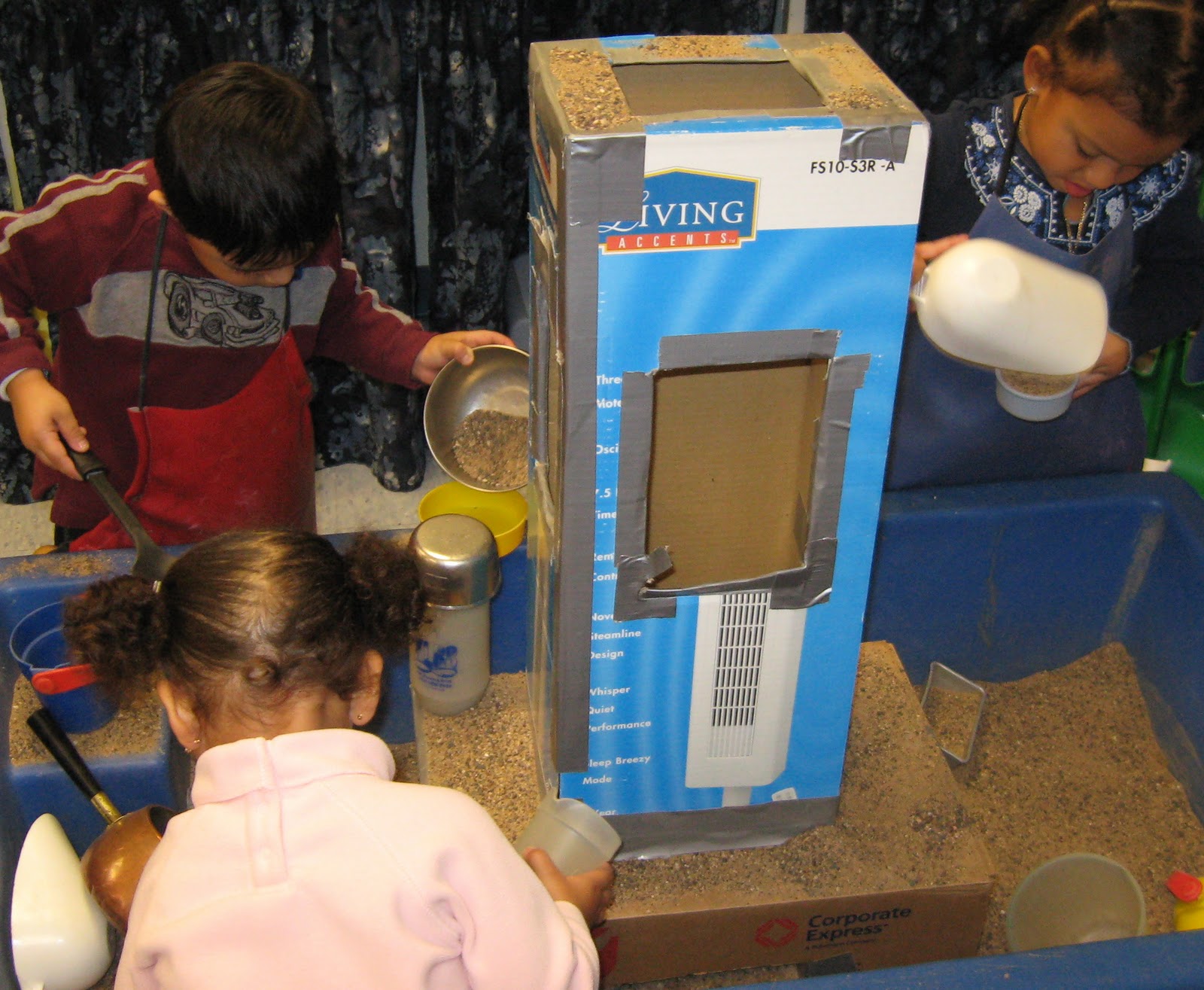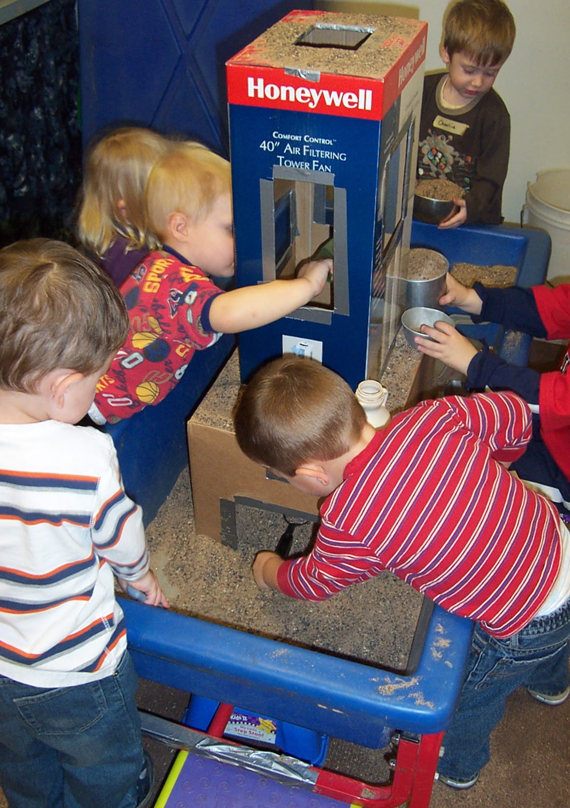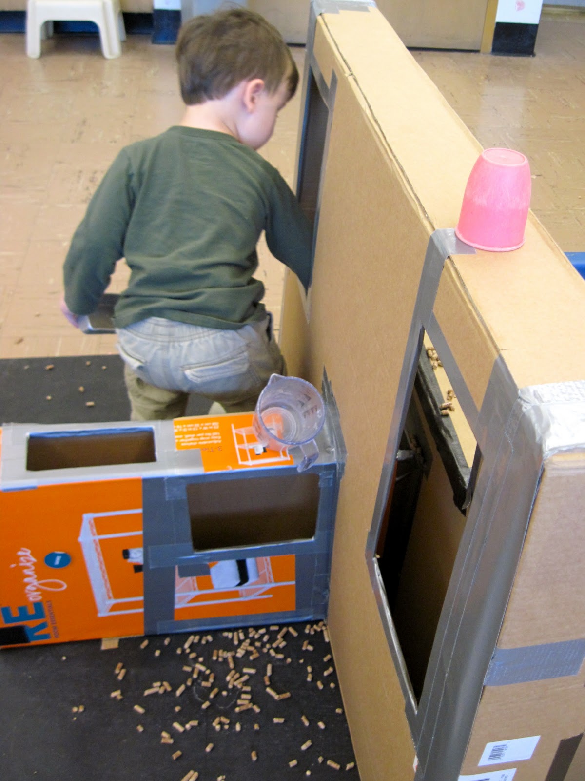 This teacher put objects---juice lids, clothes pins and cardboard shapes---in the sensory table for the children to put in the holes on both sides of the box. The objects would disappear and then come out the bottom on the side opposite the table. It was great play and exploration with toddlers using their fine and large motor skills to put things in holes. And there was always the wonderment of figuring out where those things went and the discovery of finding out they ended up at the bottom of the vertical box. Basically, it was a relatively flat, vertical plane that the children could operate on different levels.