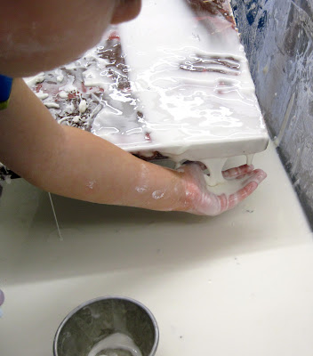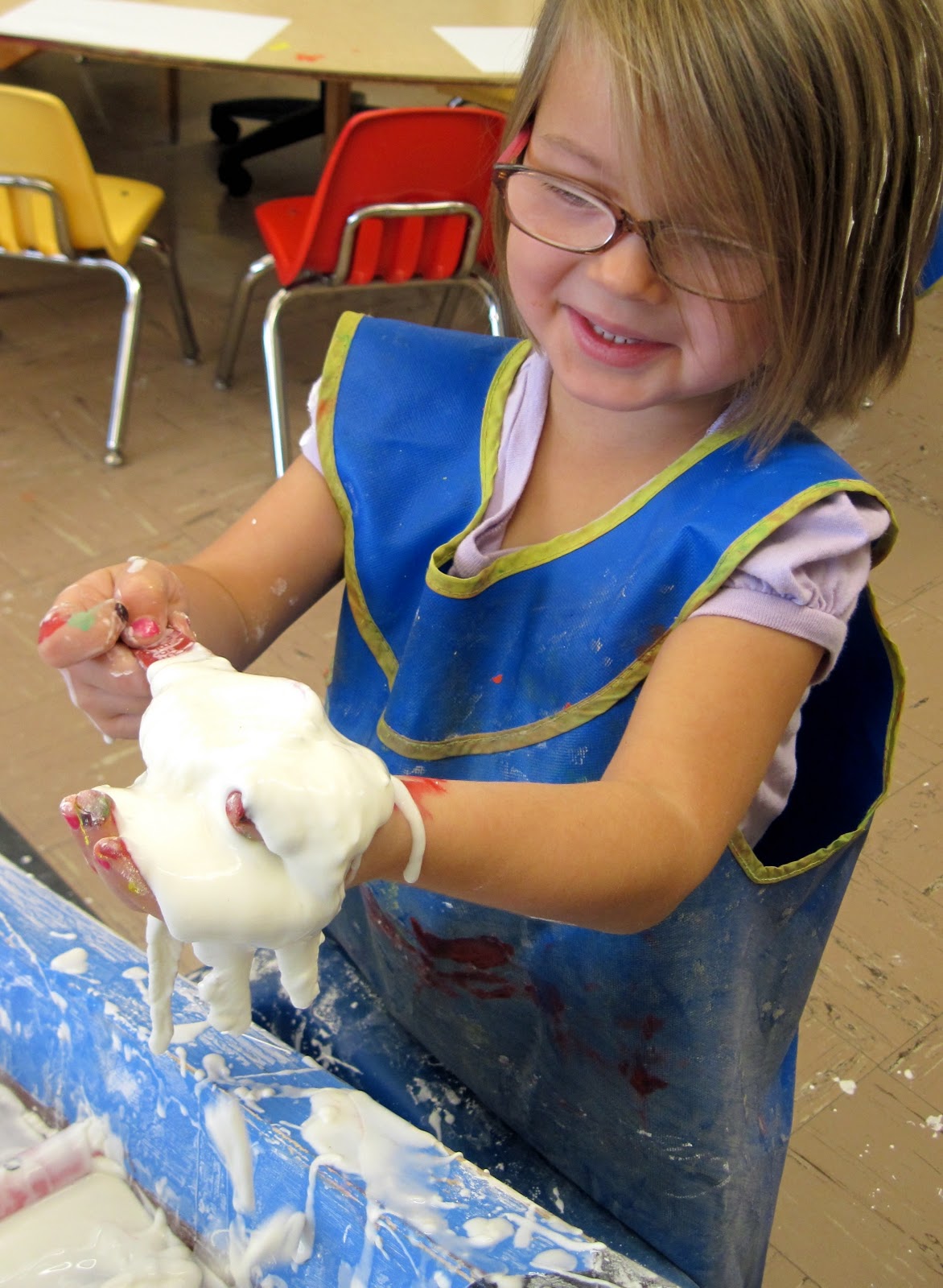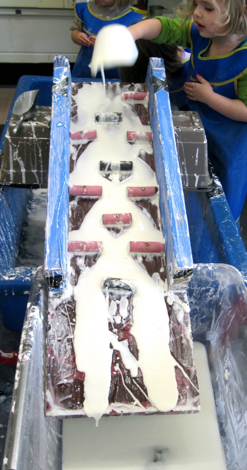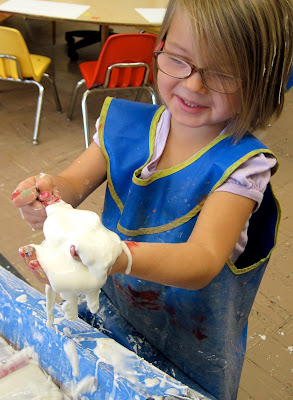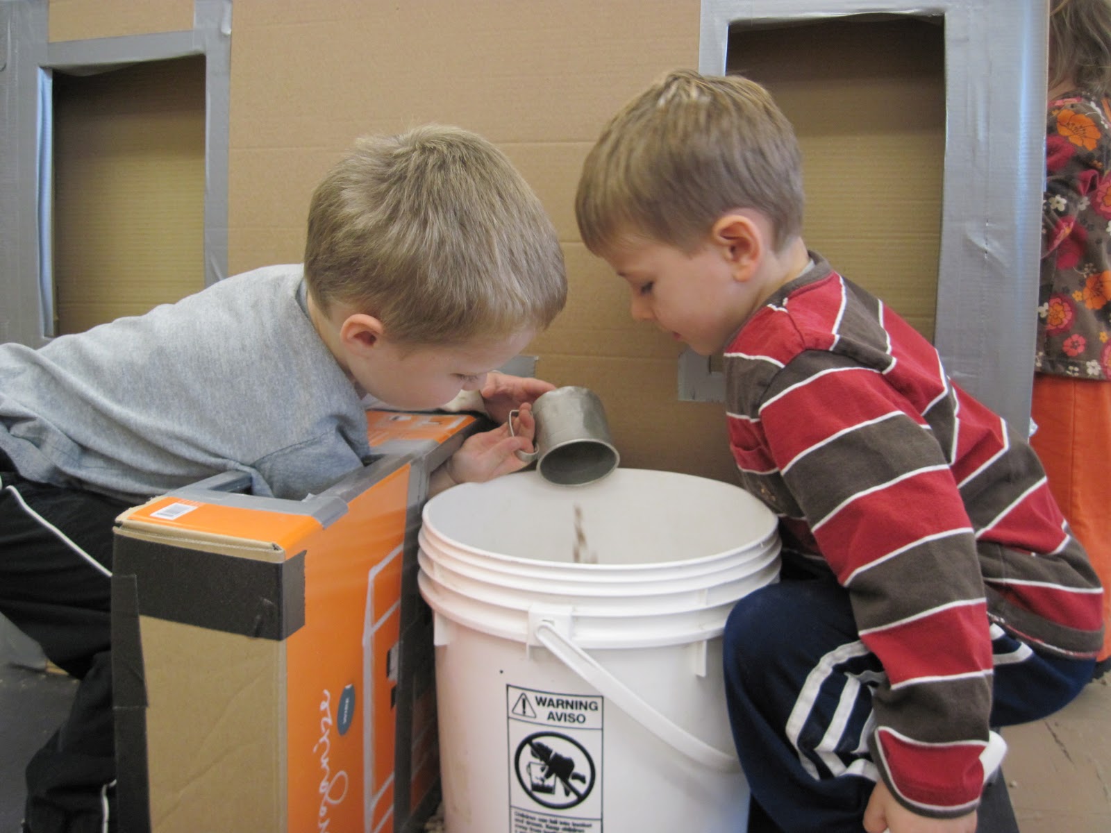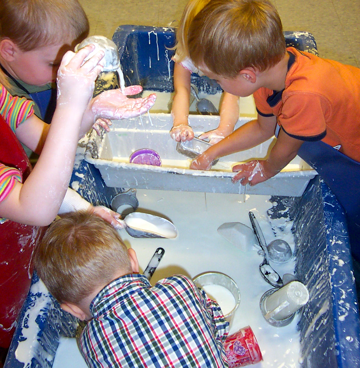 With the ramp and the oobleck, these two boys have used their imagination to recreated lava flowing down the side of a mountain. In other words, the three elements---apparatus, material and imagination---combine so these boys are foreshadowing the kind of modeling adult engineers and scientists do all the time in real life. Now that is impressive work for two young engineers and scientists.