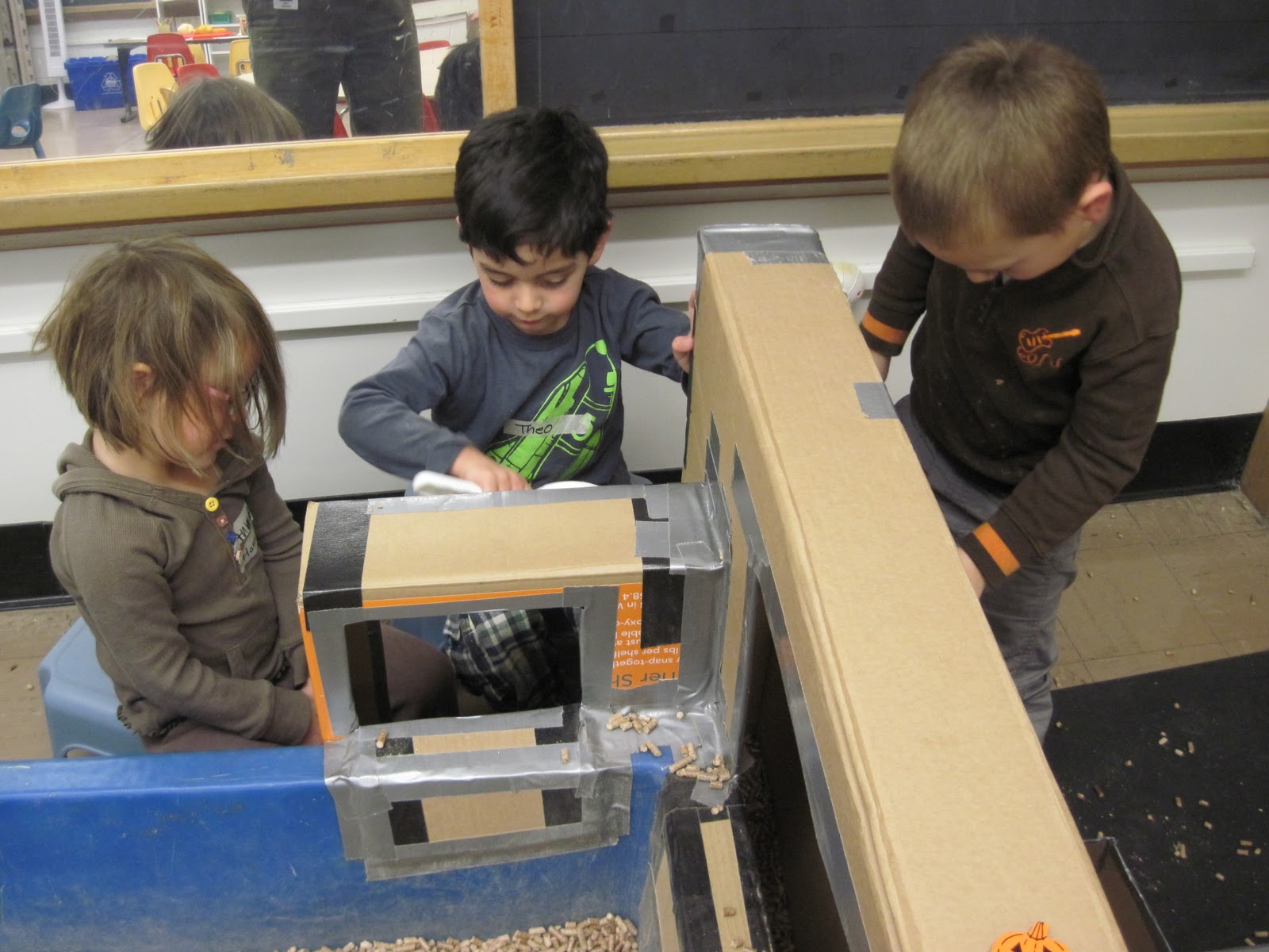 Some children start by just pouring the pellets in the hole. As the children get to know the space, they become more intentional and start to direct where they want the pellets to go.