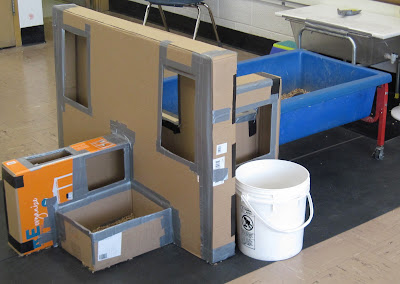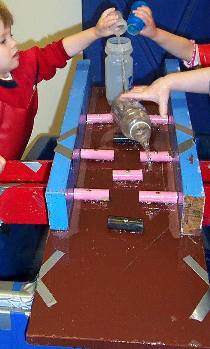 I have been asked how long I keep the same apparatus in the sensory table. I usually keep it in the table one week. Every once in awhile I keep the same apparatus in the table for two weeks, but the second week, I exchange the medium in the table to create a totally new and different experience. One of the apparatus I keep for two weeks is the Water Ramp from last week's post.