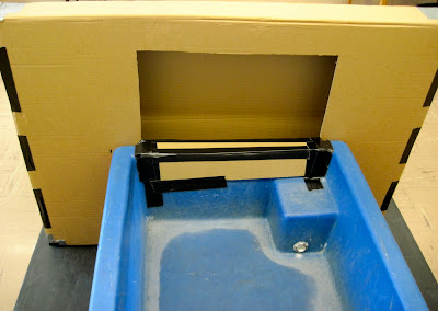 I added a third box on one side of the table. This one I did not embed. Rather I cut a hole in the side on the bottom. That left me a flap. I then cut a matching hole in the big box and was able to tape the flap from the smaller box into the bigger box.