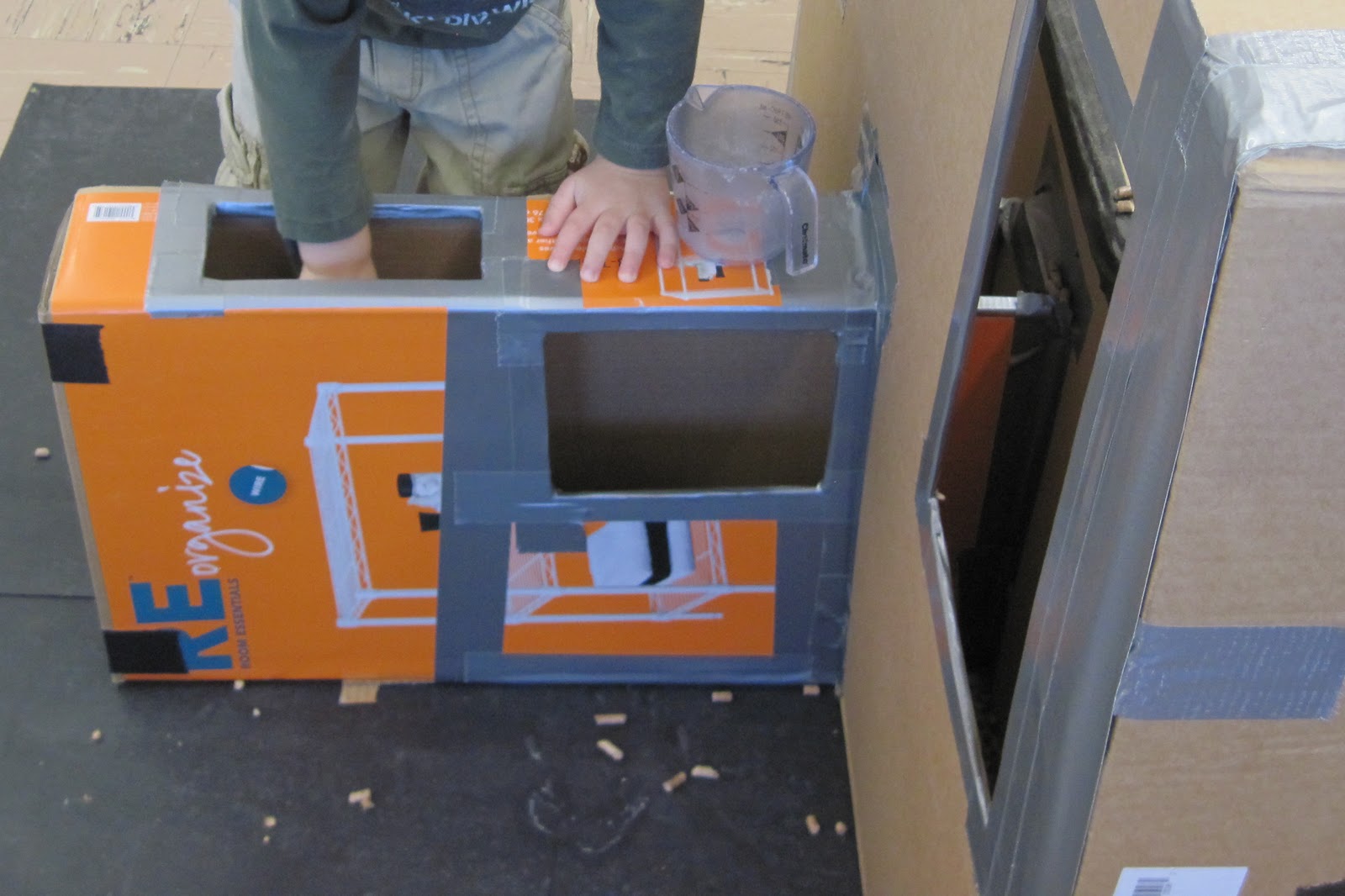 After a couple of days of play with the apparatus, I had to add a box---not vertical---under one of the holes in the orange box.