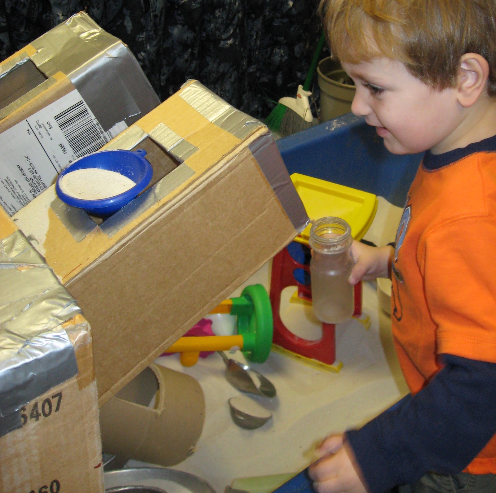 I am often asked: Do you let the children build or help build an apparatus? My answer no, not at this point. Every time I am asked, though, I have to think about it again. There are two main reasons why I do not engage the children in the building of the apparatus. One reason is that I see over 100 children a week. I see them over eight classes that only meet once a week for a two hours. It is hard to create continuity between the classes; no two children are in the same class. I see what I build for the sensory table as an installation that has to be strong and secure for all the children to use during the course of a week. The second reason is selfish: I believe everyone needs a creative outlet and building apparatus for the sensory table is mine.