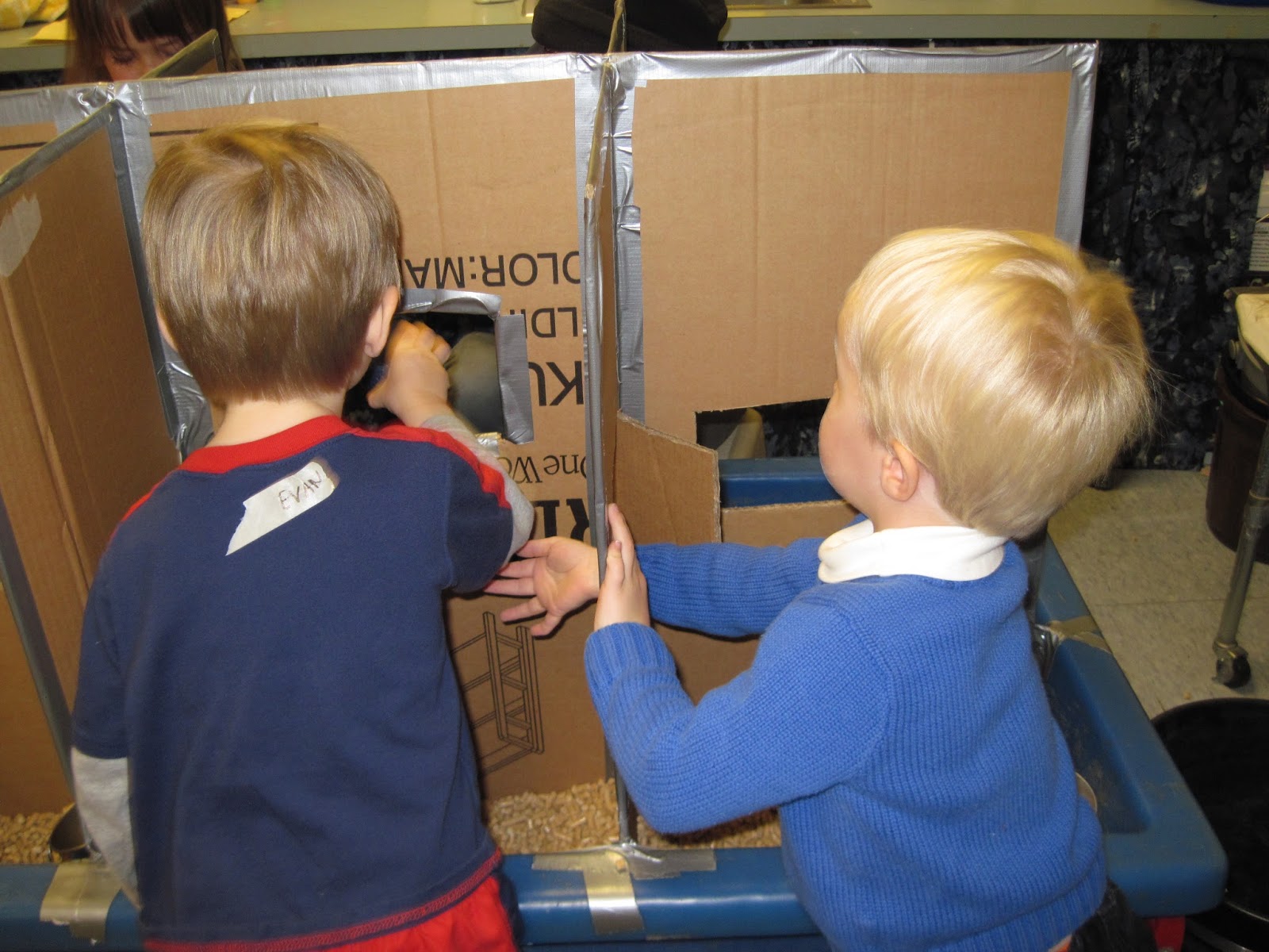 Whenever I observe children interacting with an apparatus, I am always surprised with the operations they dream up. For instance, in the picture below the child is playing in two different spaces partitioned by the cardboard. In fact, he is using the divider as a part of his operation.
