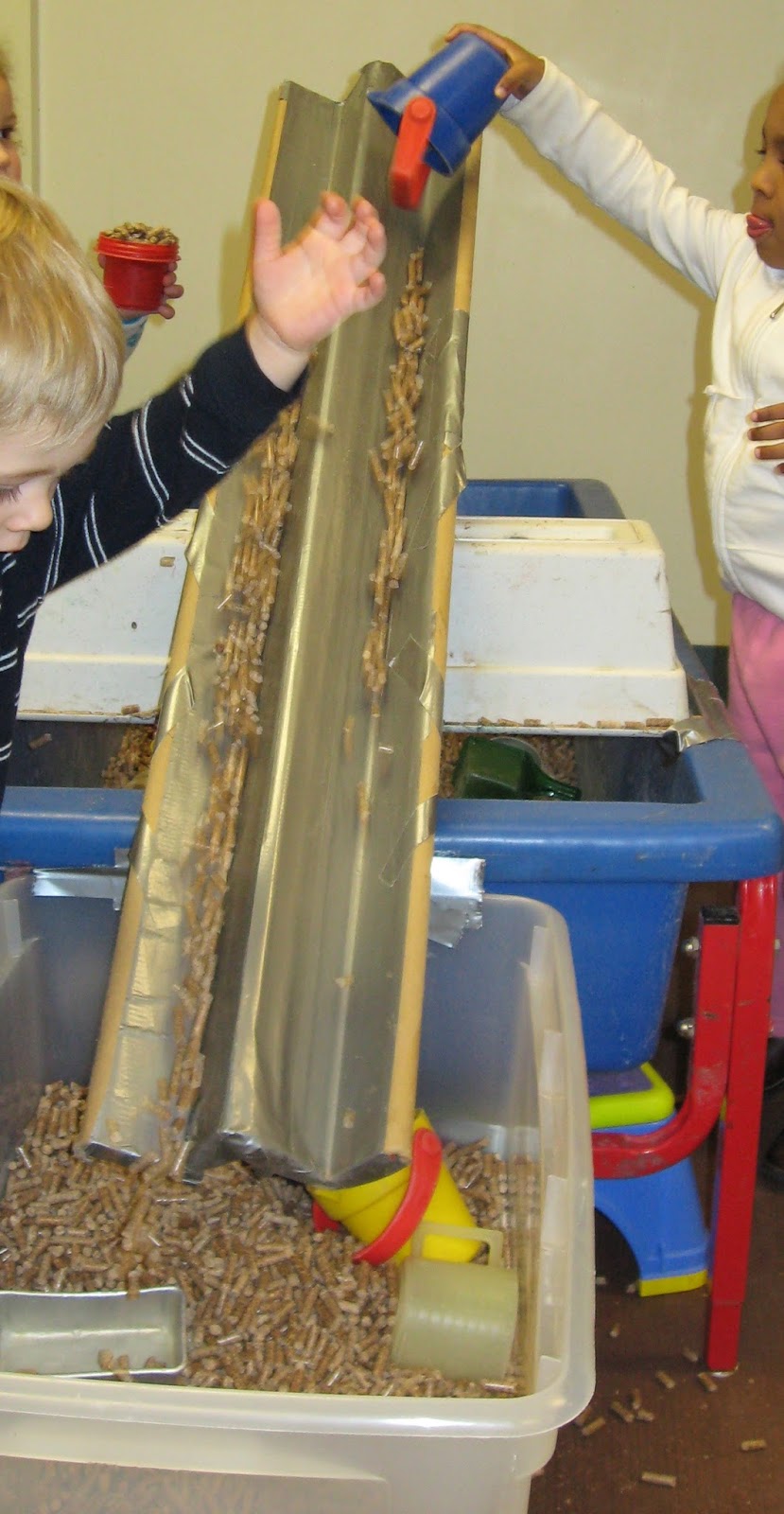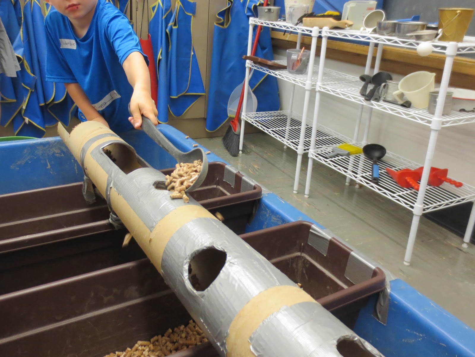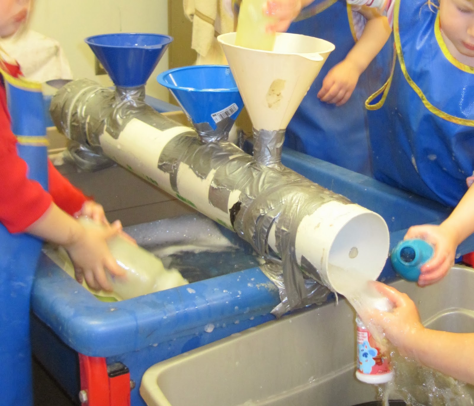 I have used this simple contraption every year because it is so engaging for the children. There is something about pouring water in one of the funnels and then watching it spill out the end of the pipe into the tub. What it is, I am not sure.