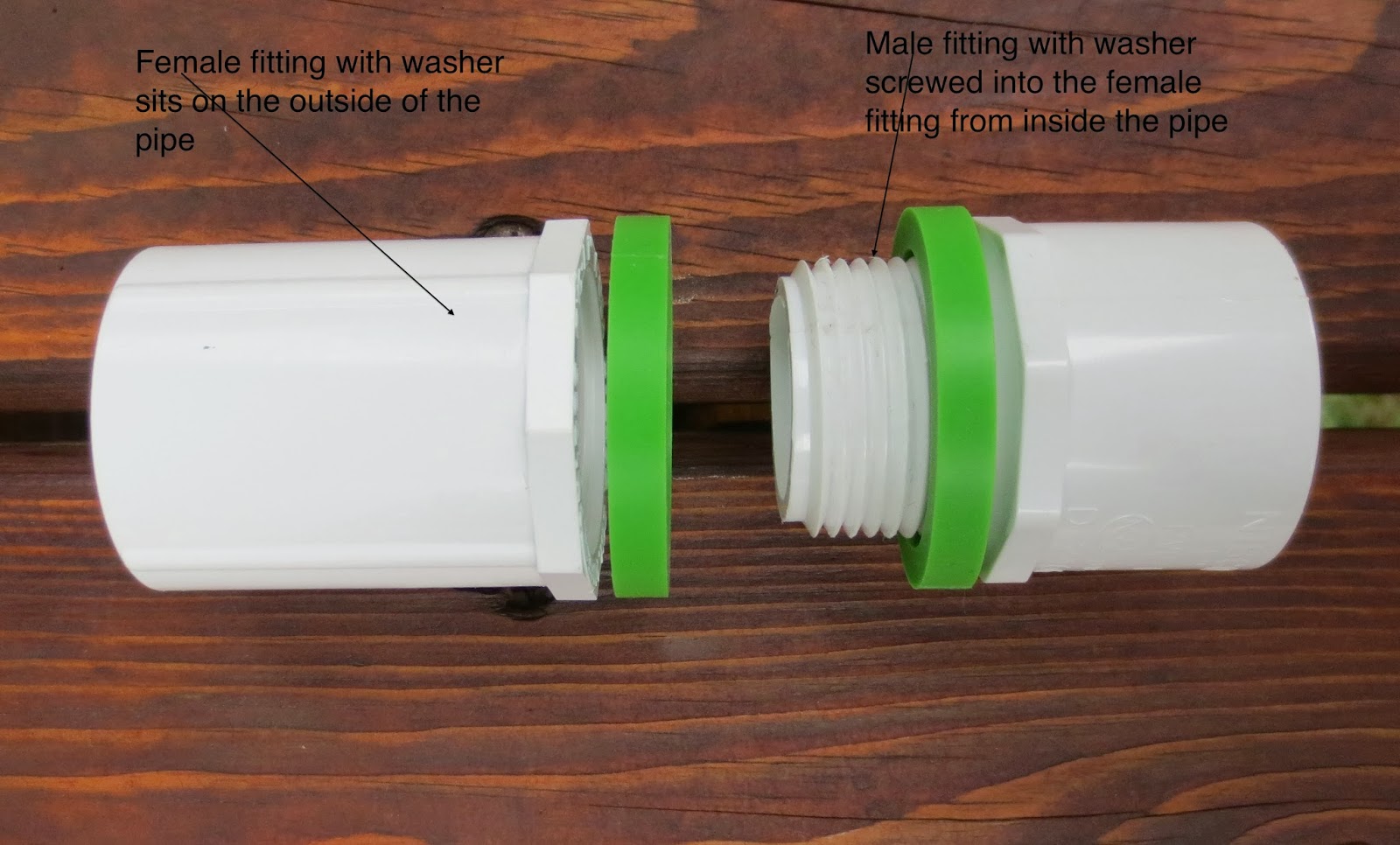 I placed the female fitting on the outside of the pipe and the male on the inside. I also added a cap to one end of the large pipe because I wanted the water to only flow out of one end.