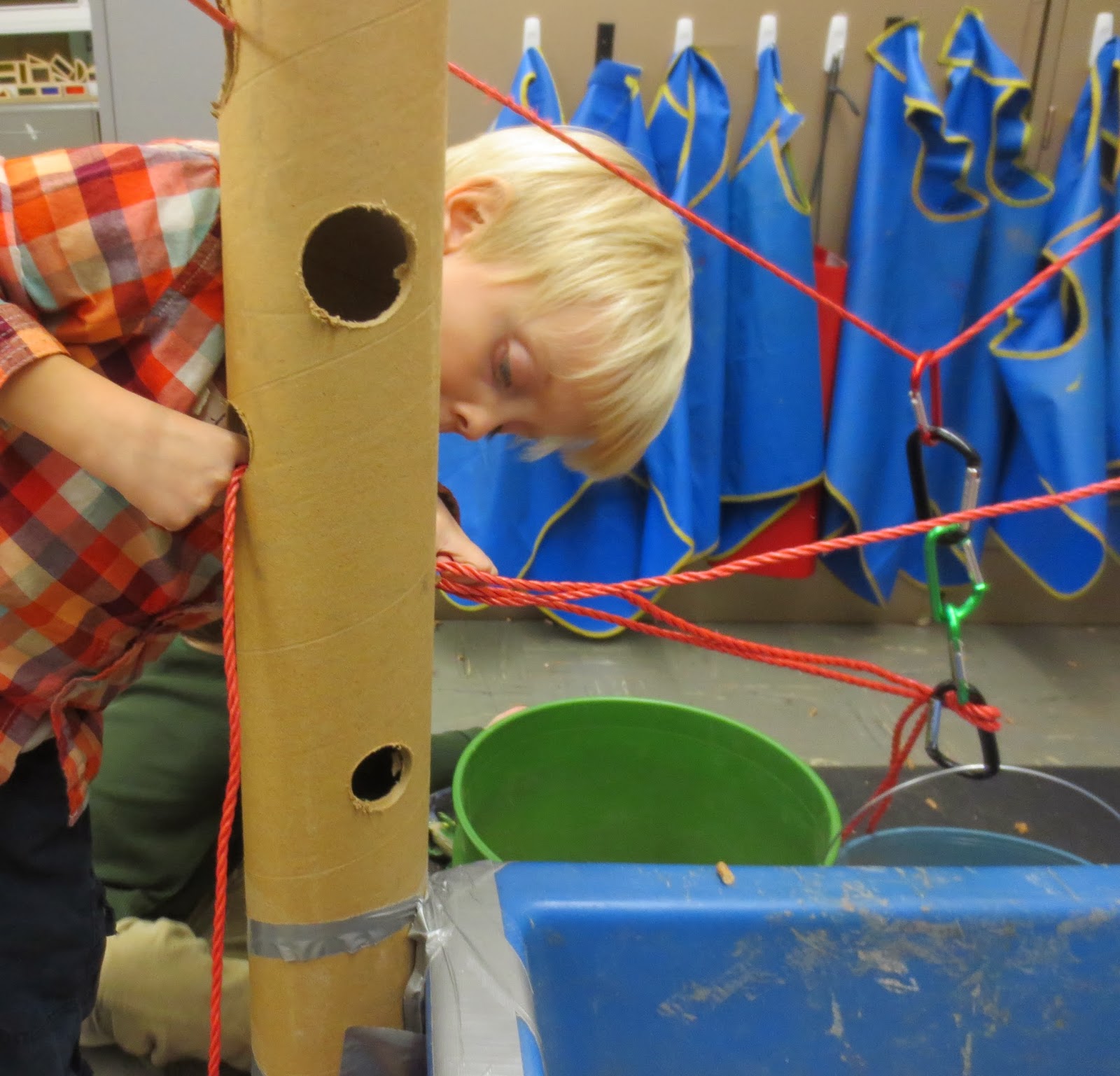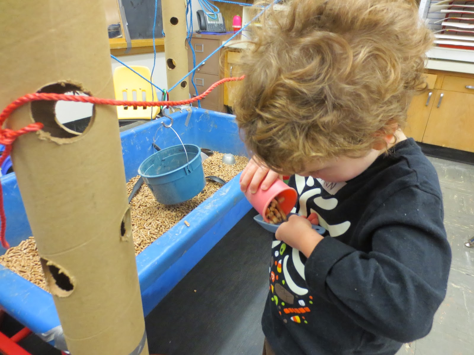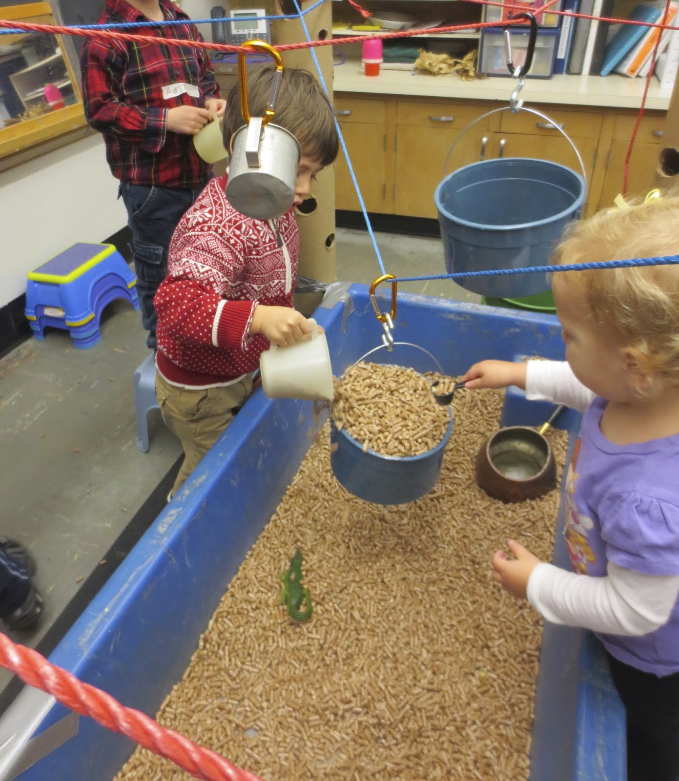 The space was provisioned with carabiners, S-hooks and pails so the children could hook things onto the rope. They certainly did that, but they did it in ways I did not expect. In the video below, the child first scoops from a pail hanging from a S-hook and a carabiner. Notice that he has to steady the pail in order to spoon the pellets. He then decides to dump the pellets back into the table. He has to pull the whole pail back over the table. He uses both hands, but then he places his left arm under the pail and his right hand on the lip to tip the pail. As he finishes emptying the bucket, he gently releases the bucket to swing back into place almost as if he is anticipating the subsequent motion.