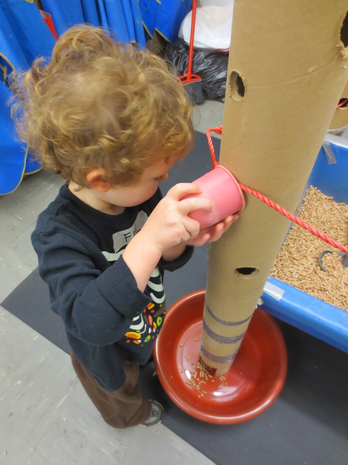 This child has created a new sensory experience for himself by completing a cycle of pouring pellets through the top hole of the tube and then sticking his hand in a hole lower on the tube so he can feel the falling pellets he has just poured.
