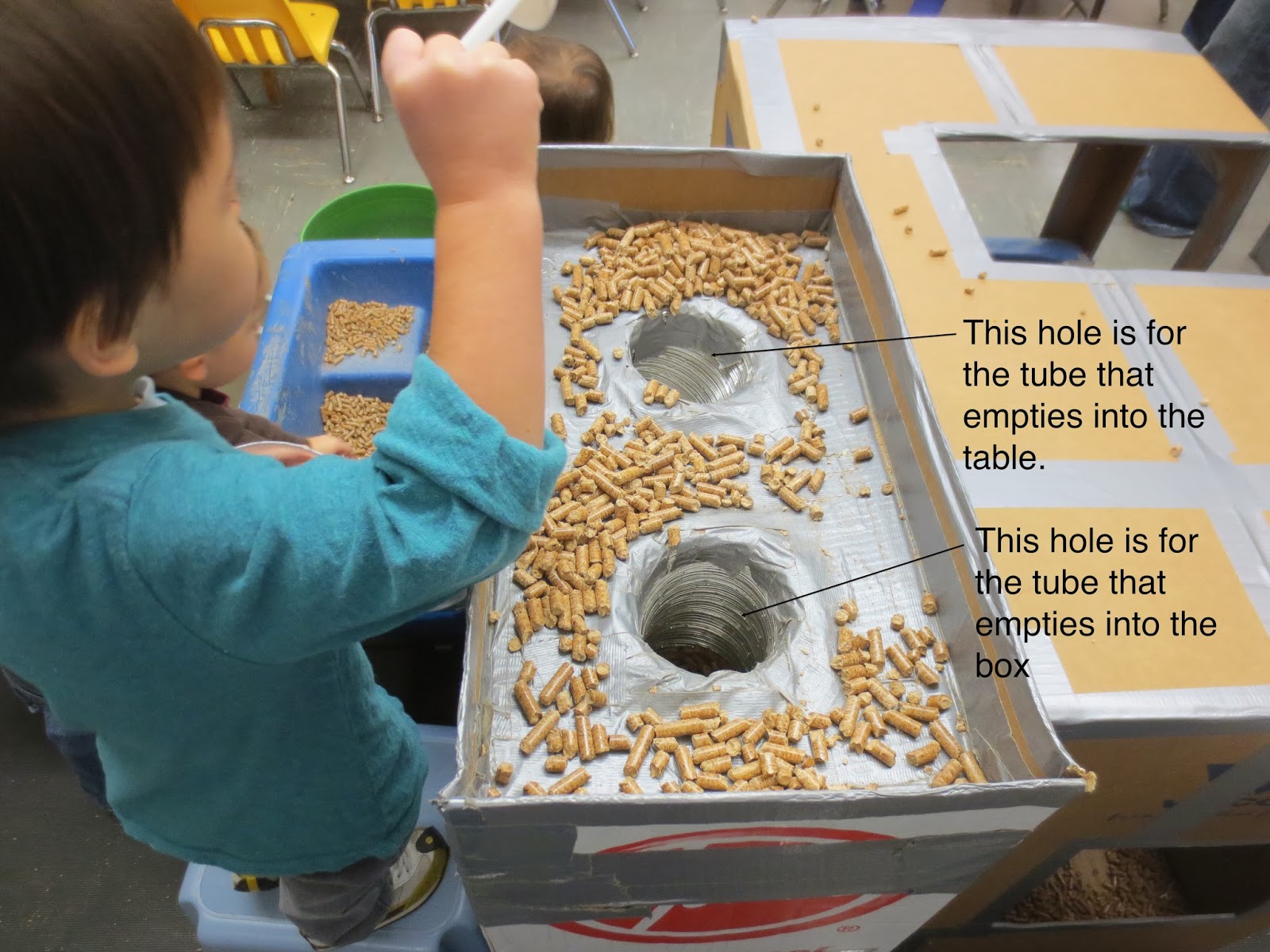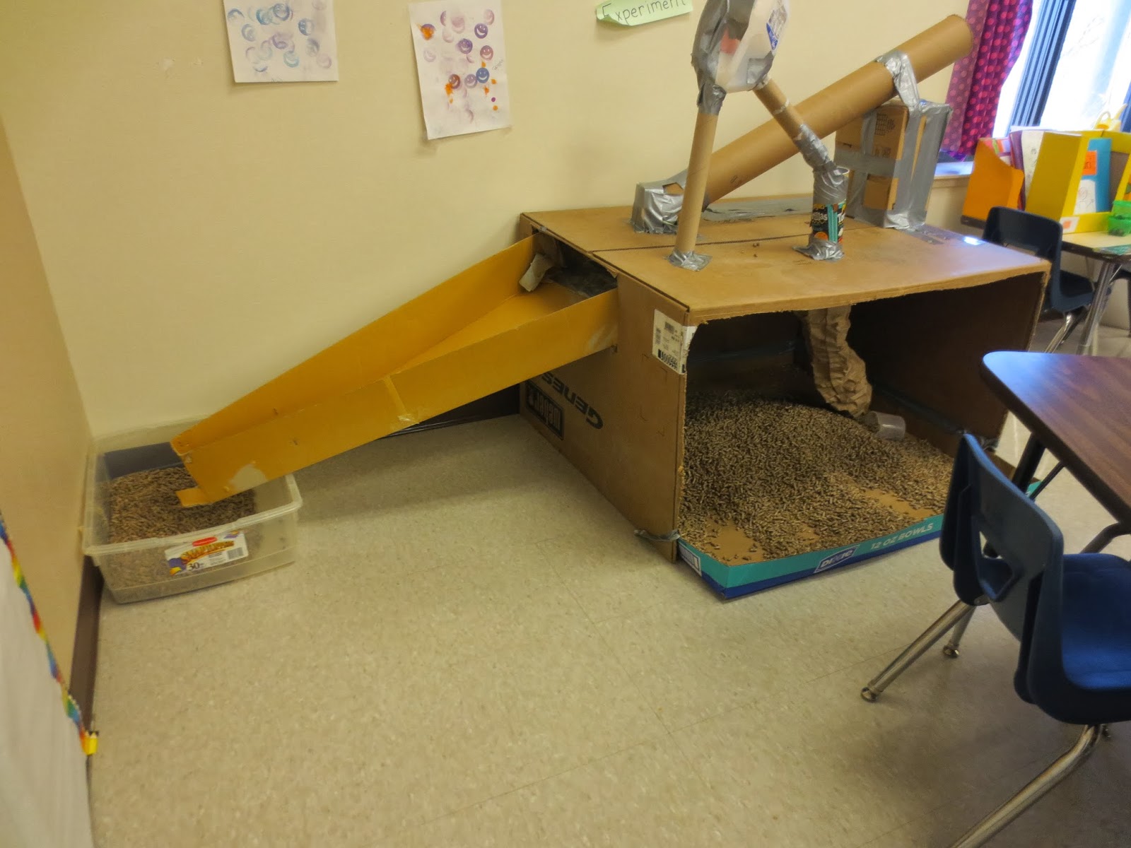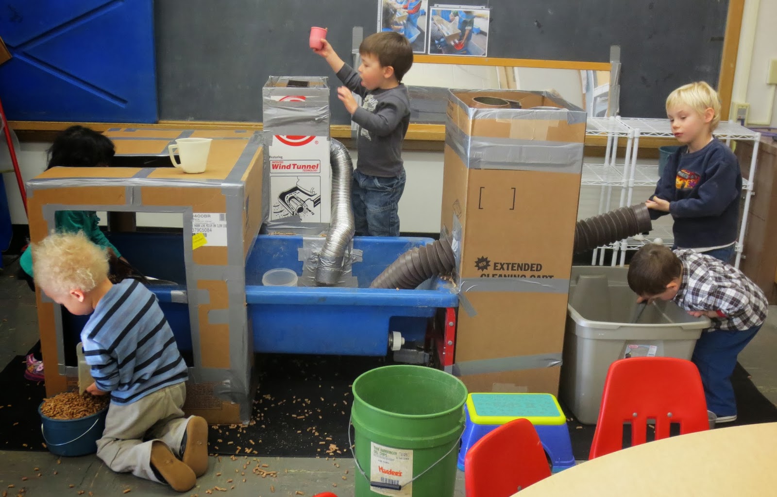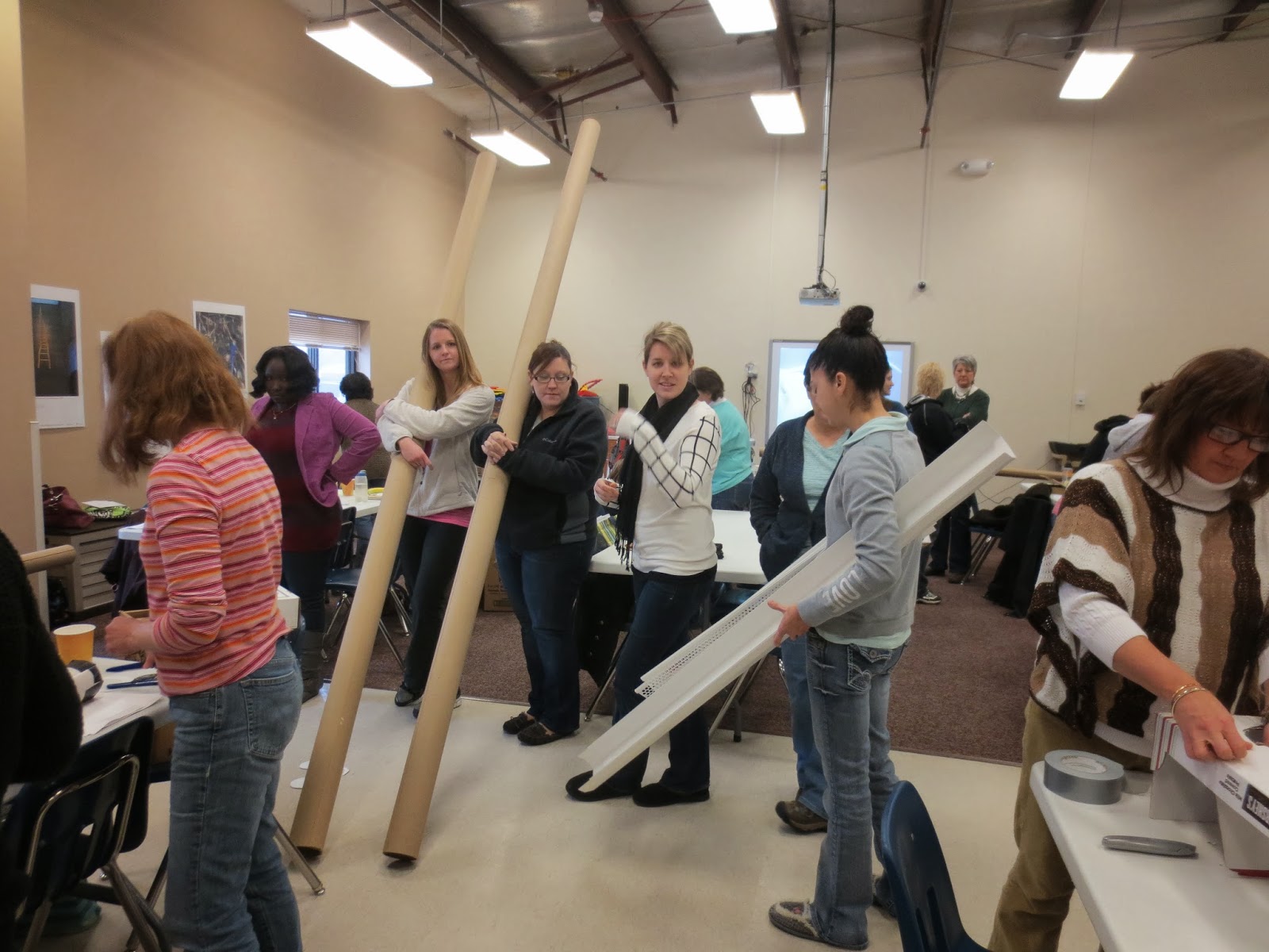 The day before the workshop Shirley and Karen, the director, gave me a tour of the Head Start building. The first room I saw was the room I was to present in. It was a large room because they were expecting about 60 or so staff. Right away I noticed they had a small hill of boxes, a stack of long cardboard tubes and a table of tools and tape. I knew they were ready.