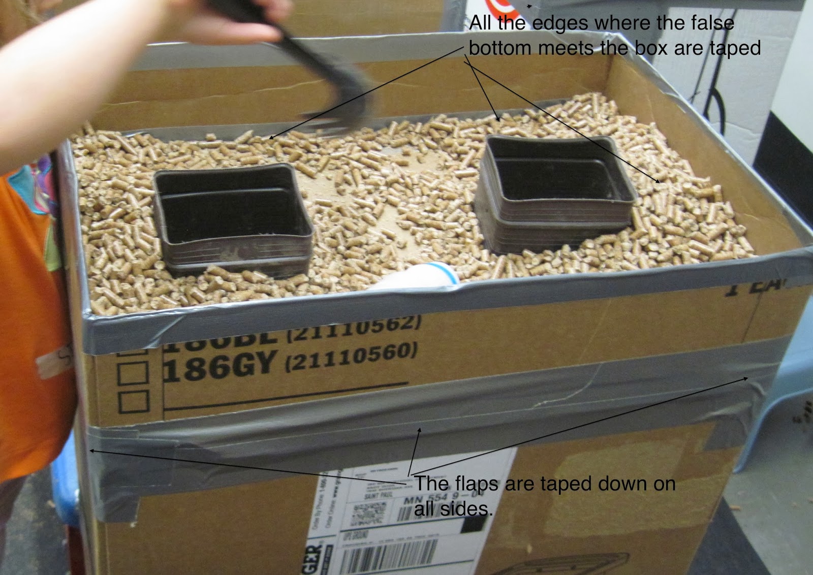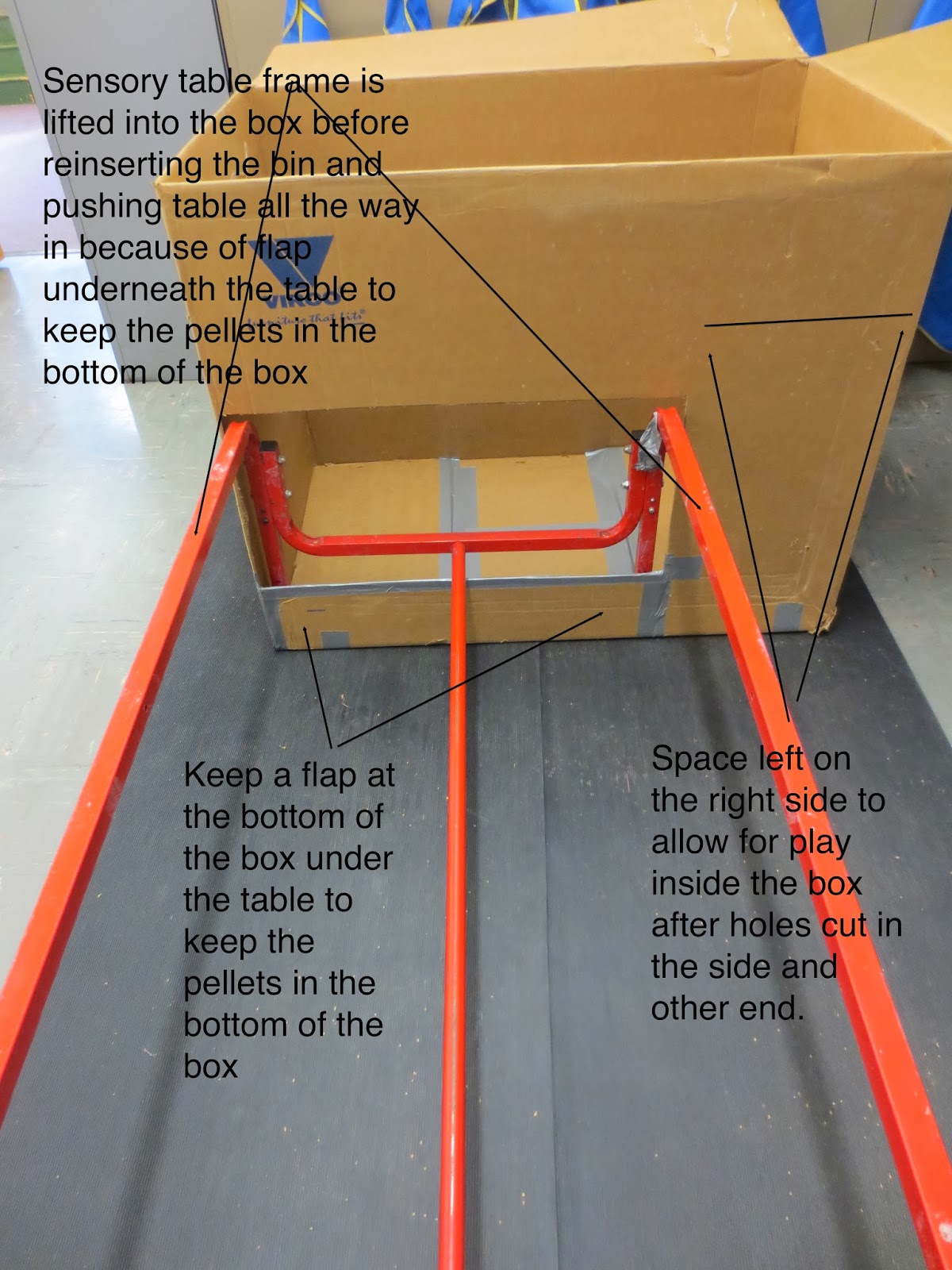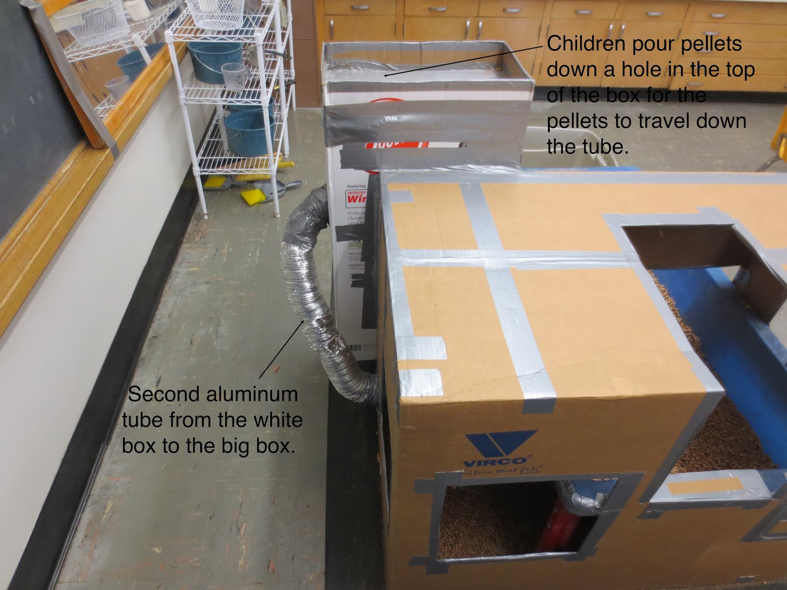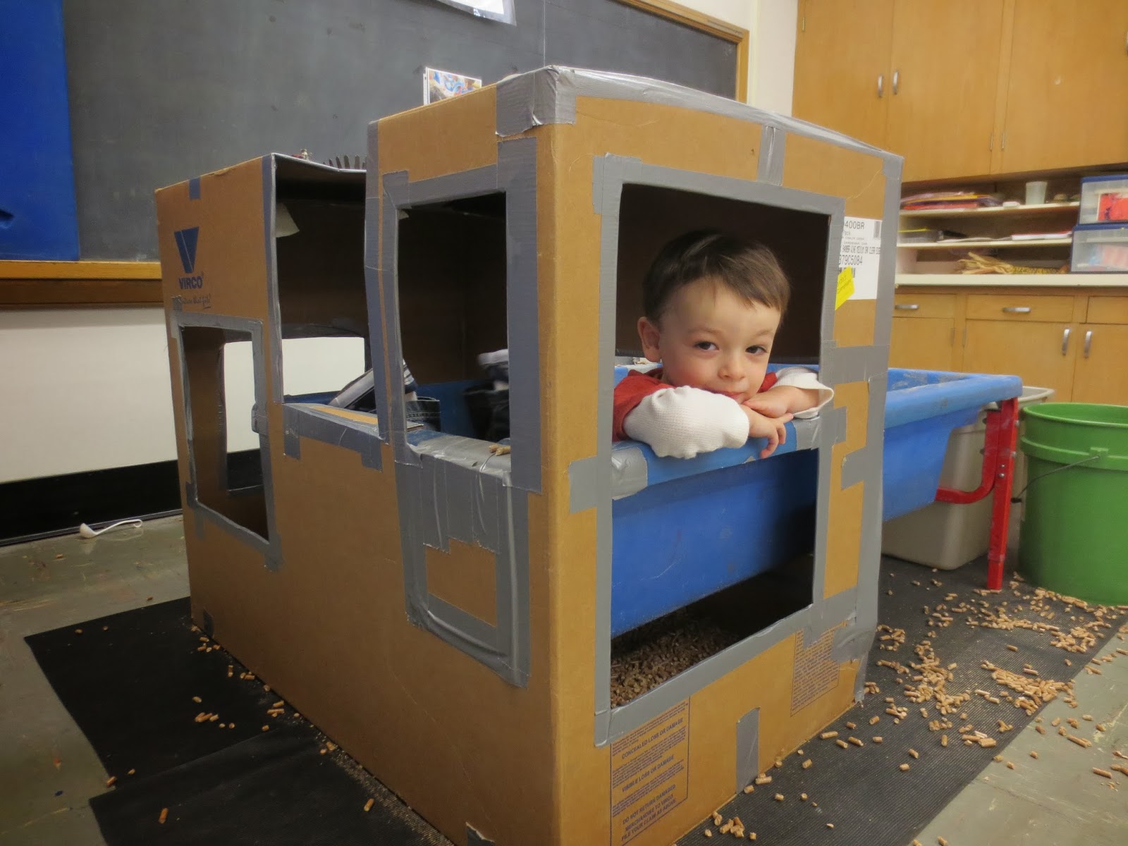You can see the documentation on the cabinets in the back. You can also see the table of tools and cart of PVC pipes. And if you look to the left at the end of the cabinets behind the colorful mat, you can see the small hill of boxes.